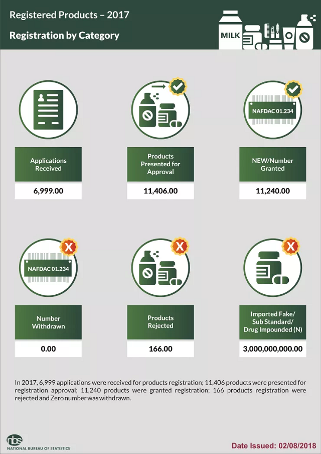 Registered products 2017 data revealed that 4,296 applications were received for new products registration,6999 products were presented for registration approval, 11,406 products were granted registration; 166 products registration were rejected and Zero number was withdrawn while fake and sub-standard products worth N3,000,000,000 were impounded during the year.