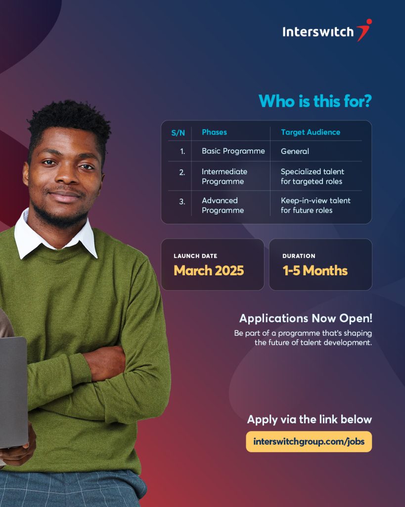 Kicking off this month of March, the initiative will assume a phased approach for different categories of applicants. The Basic Programme will set the tone for various areas of interest, presenting opportunities to eligible members of the public, later transitioning to a tailored Intermediate Programme which will target specialized talent across specific roles. The final phase will culminate in the Advanced Programme designed to equip and shortlist exceptional applicants who may ultimately be integrated into Interswitch’s workforce.