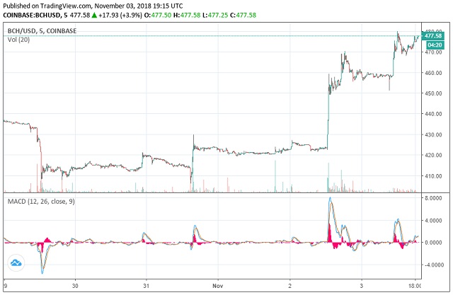 Upon the announcement of Bitcoin.com and Binance, the price of Bitcoin Cash increased from $425 to $460, briefly reaching $470. Since then, the price of BCH has risen from $460 to $477, with strong momentum and volume