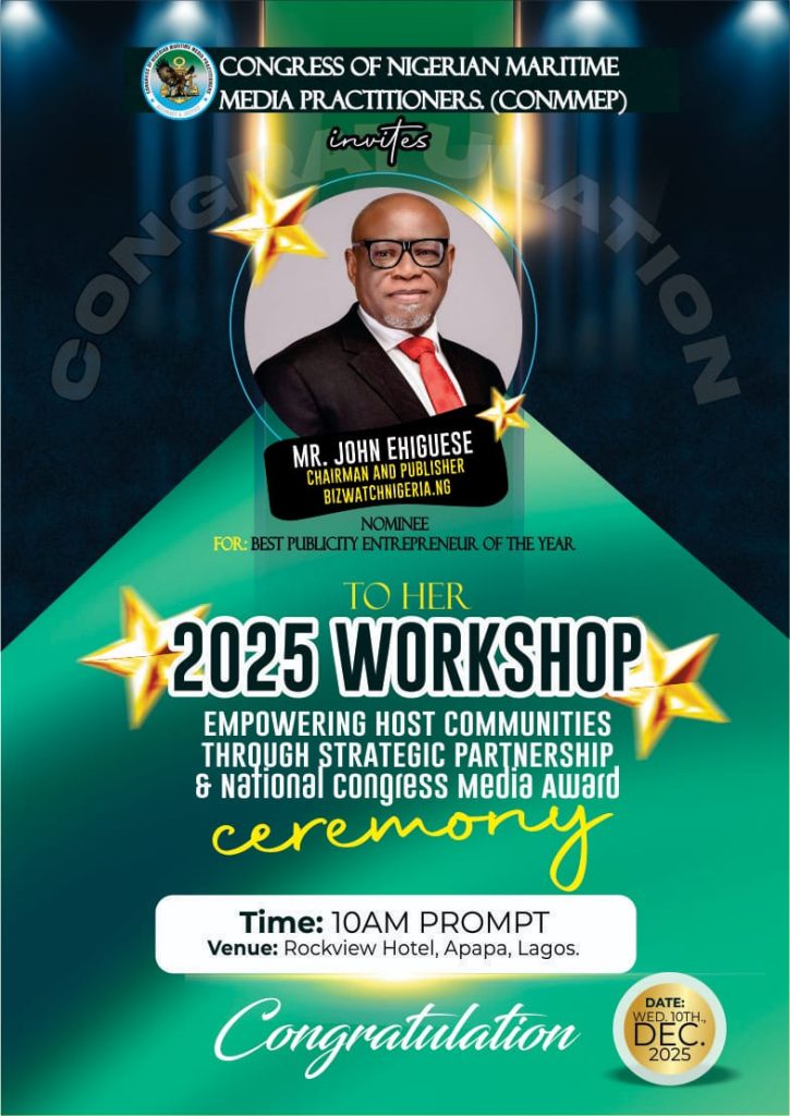 The Publisher of BizWatch Nigeria, Mr John Ehiguese, has been honoured with the Publicity Entrepreneur of the Year Award at the 2025 Annual Workshop of the Congress of Nigerian Maritime Media Practitioners (CONMMEP), held on Wednesday at Rockview Hotel, Apapa, Lagos.