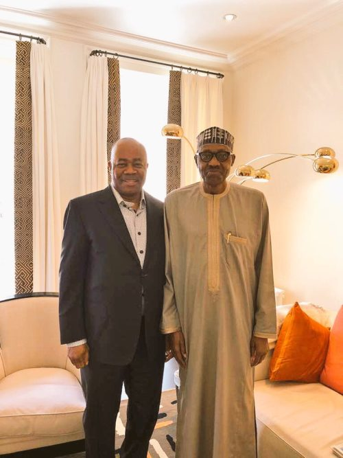 Senate minority leader, Godswill Akpabio met vacationing President Muhammadu Buhari in London today, four days before he crosses over to the All Progressives Congress.