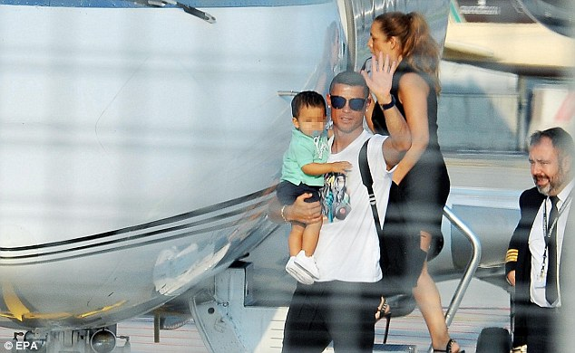 He was seen descending the steps of a private jet with his family, including his youngest son, and a number of his entourage in tow.