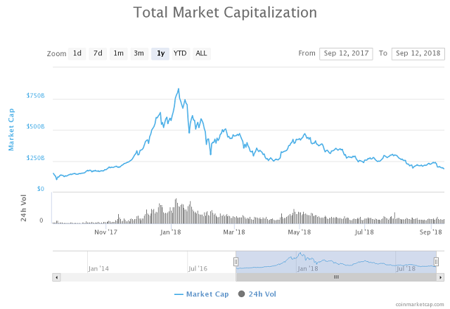 The cryptocurrency market capitalization on September 12 established a new yearly low near circa $187 billion.