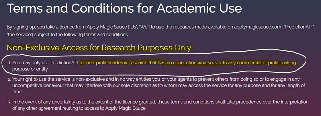When a user clicks on the “App Terms” link for the Apply Magic Sauce app, it links to a page saying that the information collected through the quiz is intended for “non-exclusive access for research purposes only” and only for “non-profit academic research that has no connection whatsoever to any commercial or profit-making purpose or entity.”