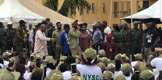 The News Agency of Nigeria (NAN) reports that security personnel had a hard time controlling fellow corps members and NYSC staff rushing to take a glimpse of the popular musician.