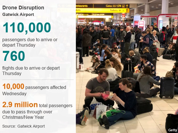 About 10,000 passengers were affected overnight on Wednesday and Gatwick said 110,000 people were due to either take off or land at the airport on Thursday.