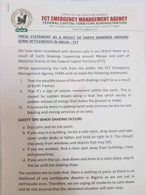 The Emergency Management Agency of Nigeria’s Federal capital of Abuja has confirmed reports of earth tremor reported by residents.