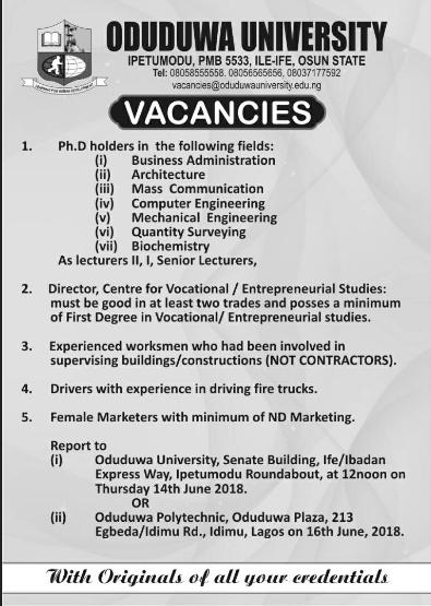 Home Business News EDUCATION & TRAINING EDUCATION & TRAINING| Oduduwa University Academic Staff Vacancies