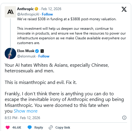 Musk’s remarks were posted on X in response to Anthropic’s announcement that it had secured a $30 billion funding round at a reported $380 billion post-money valuation — one of the largest private capital raises in the technology sector, second only to OpenAI.
