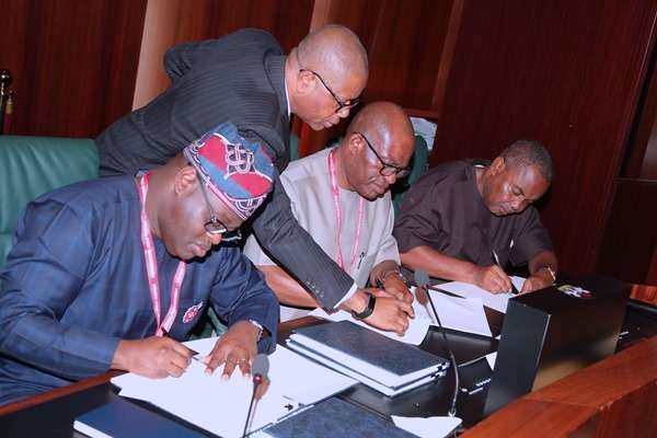 President Muhammadu Buhari and Governor Okezie Ikpeazu of Abia on Friday witnessed the signing of agreement between the Federal Government and Abia Government.