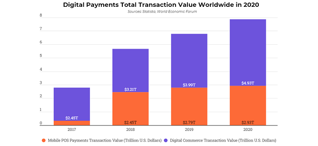 According to Statistics, the total transaction value in digital payments is projected to grow at 23.7% in 2020 to reach $ 4.93 trillion. The number of digital payment users is forecast to increase by 10.1% YoY to reach 3.47 billion in 2020.