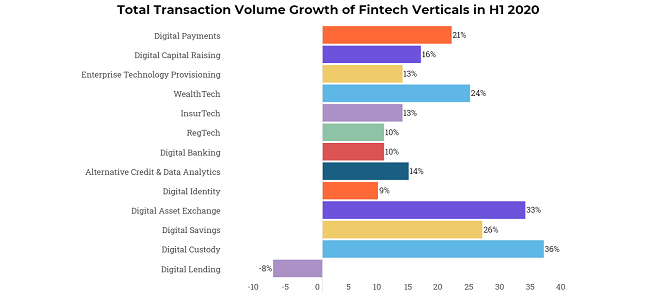 Other verticals showing remarkable growth included digital custody (36%), digital asset exchange (33%), digital savings (26%) and WealthTech (24%).