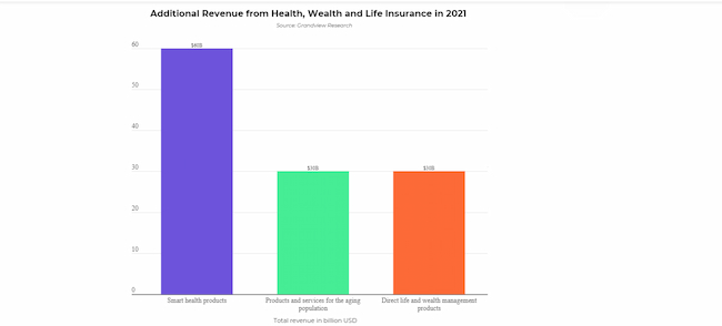 A convergence of the health and wealth industry with life insurance is forecast to generate an additional $120 billion in revenue. Smart health products will take center stage, contributing $60 billion to the total. Products and services for the aging population will account for $30 billion. Direct life and wealth management products will add the remaining $30 billion.