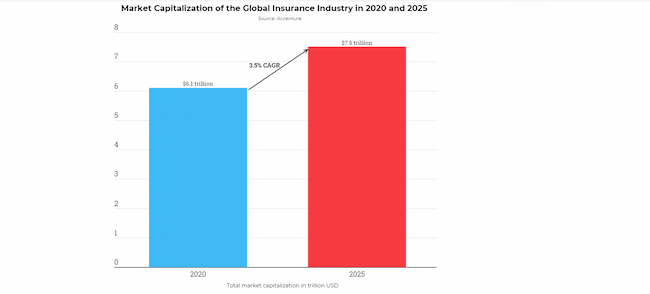 According to the research data analyzed and published by ComprarAcciones.com, the global insurance industry was worth $6.1 trillion in early 2020. The researcher projects that it will grow at a 3.5% Compound Annual Growth Rate (CAGR) to $7.5 trillion by 2025.
