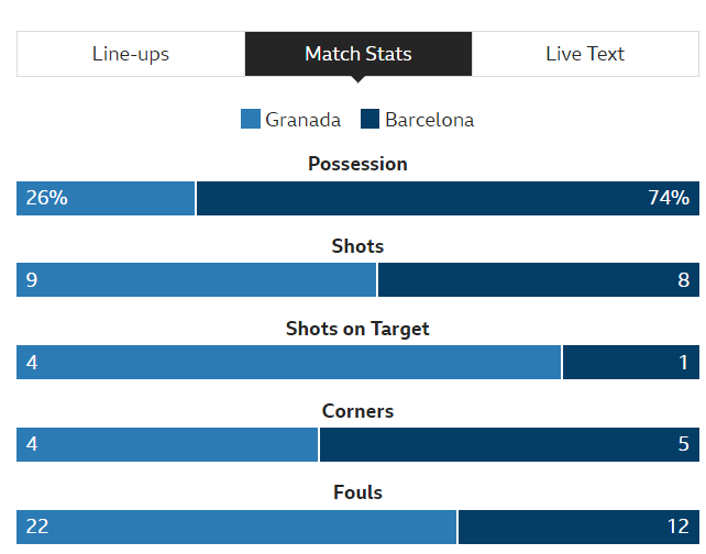 An uncharacteristic bluntness in attack was apparent in defeat to Granada, with the visitors failing to register a shot on target in the first half and landing just one of their eight shots – from Messi in 82nd minute – on target in all.