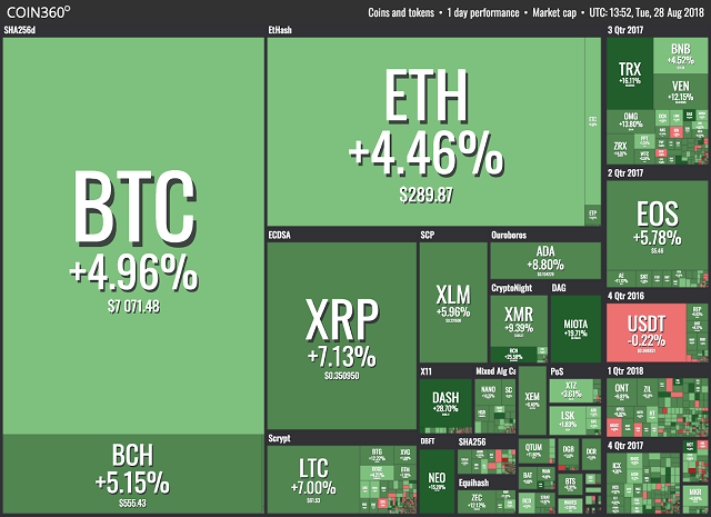 Tuesday, August 28: crypto markets are seeing strong positive momentum bolster a persuasive recovery, as Bitcoin (BTC) breaks above the $7,000 price point and all but 3 altcoins amid the top 100 cryptocurrencies post strong gains on the day. Growth among the top ten largest assets ranges between 4.5 to almost 20 percent, as Coin360 data shows.