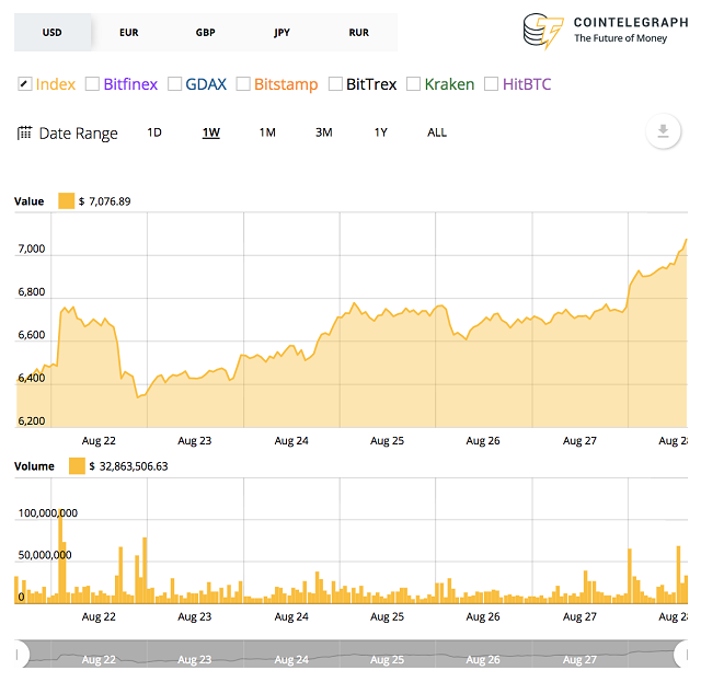 Bitcoin (BTC) is trading at around $7,016 at press time, up around 4.2 percent on the day, according to Cointelegraph’s Bitcoin price index.