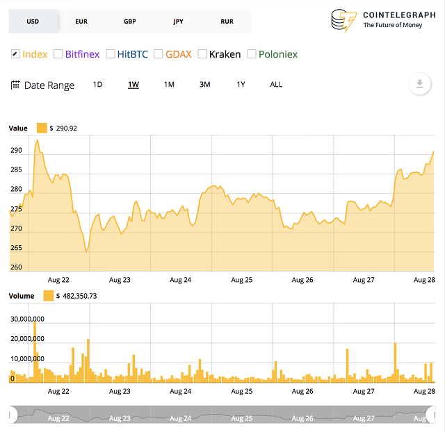 While, the coin has yet to reclaim the $300 price point — which it last held August 20 — today, August 28, has seen the first persuasive upswing in price performance after a jagged and tentative week range bound between $270-280. Ethereum is now up 3.4 percent on the week; on the month, losses are just slightly down and remain at a stark 37.8 percent.