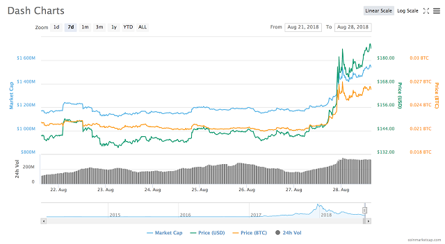 Among the top twenty coins on CoinMarketCap, TRON (TRX) is up 14.5 percent on the day to trade around $0.03, NEO is up 15.77 percent at $21.18 and DASH, ranked 13th, has outstripped all the top 100 cryptos on the day by rising 27 percent to $186.54.