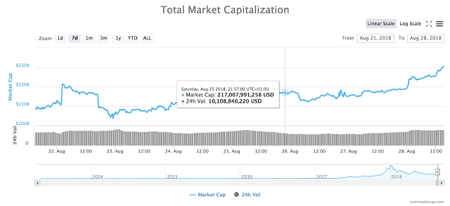 Total market capitalization of all cryptocurrencies is at around $230.55 billion at press time, up around $15 billion since the start of trading Monday 27th.