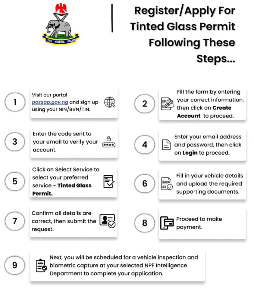In an effort to simplify access to official documentation for vehicle owners, the Nigeria Police Force has released a detailed nine-step process for obtaining a tinted glass permit via its official digital platform.