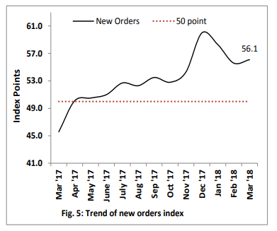 At 56.1 points, the new orders index grew for the twelfth consecutive month, indicating increase in new orders in March 2018. Six subsectors reported growth, 5 remained unchanged while 3 contracted in the review month (Fig. 5 and Table 3).