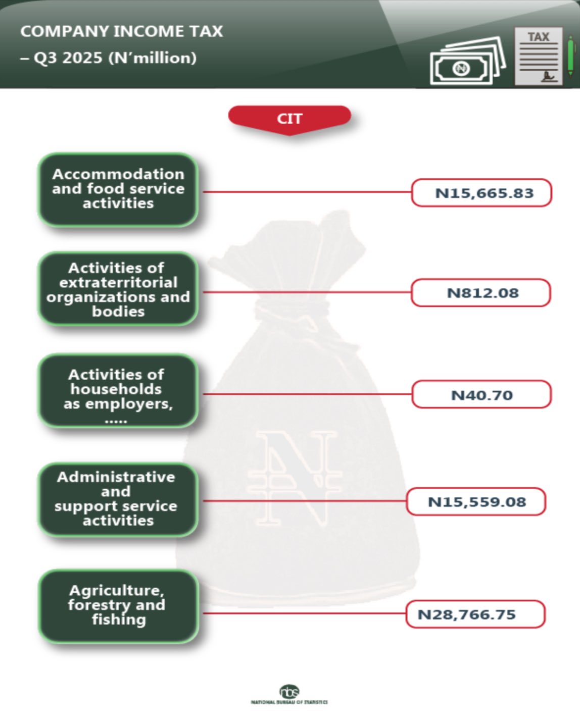 - Company Income Tax collections rose 6.55% quarter-on-quarter to ₦2.96 trillion in Q3 2025