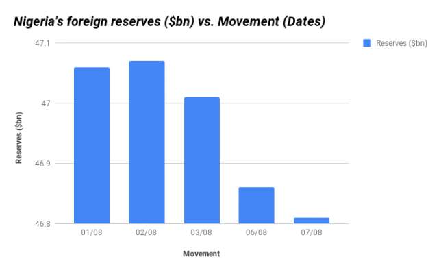 Nigeria’s foreign exchange reserves dipped by $260 million to $46.81 billion as at August 7, 2018.