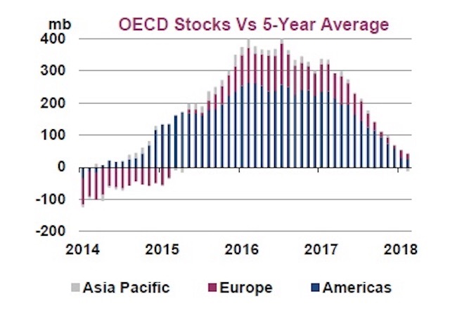 “Our balances show that if OPEC production were constant this year, and if our outlooks for non-OPEC production and oil demand remain unchanged, in 2Q18-4Q18 global stocks could draw by about 0.6 million bpd,” the IEA said.