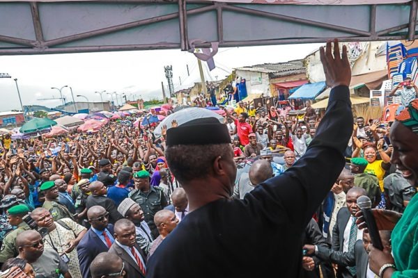 Earlier on arrival at the market, Prof. Osinbajo went round interacting with petty traders before he proceeded to address traders who had thronged access roads around the market to receive him.