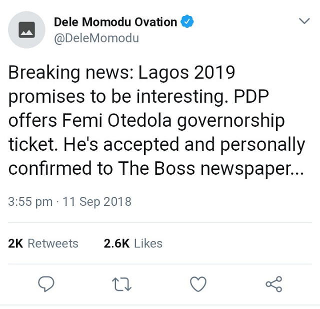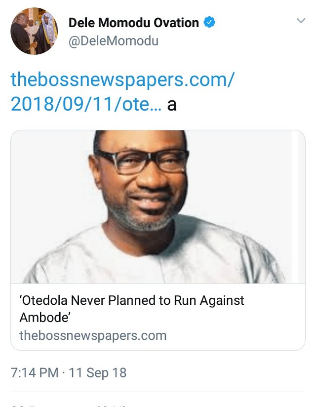 But in another tweet by Momodu, Otedola claimed that he would not run for the Lagos governorship seat in 2019 and would rather wait until 2023, if Amode emerges as APC flag bearer.