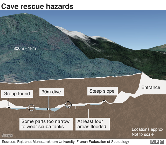 The initial part of their journey, through narrow, submerged passages, is the most challenging, the BBC’s Jonathan Head reports from near the cave.