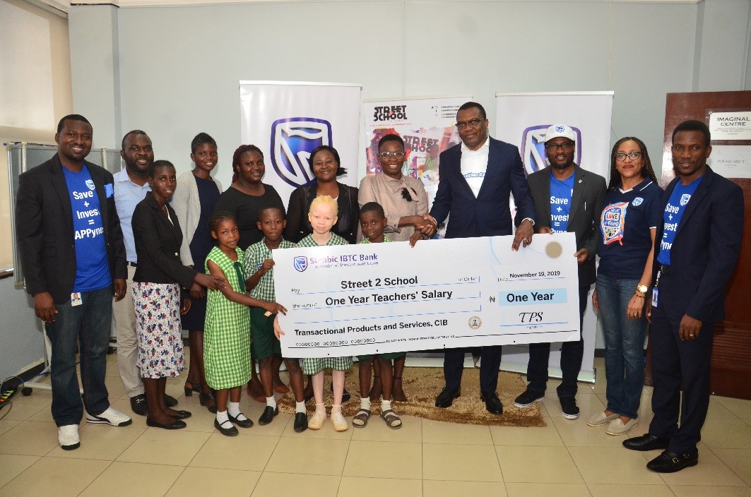 Staffs of the Stanbic IBTC presenting a cheque of the One Year Teacher Salary Support to Street 2 School teachers.