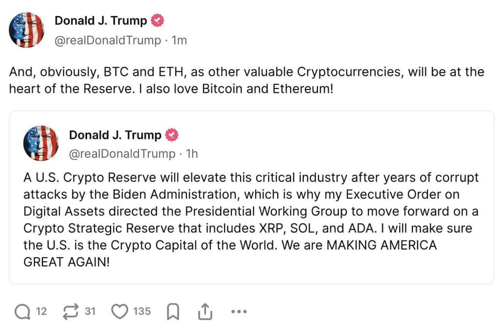 “The U.S. Crypto Reserve will strengthen this critical industry after years of corrupt attacks by the Biden Administration. My Executive Order on Digital Assets has directed the Presidential Working Group to move forward on creating a Crypto Strategic Reserve, which will include Ripple (XRP), Solana (SOL), and Cardano (ADA),” Trump stated.