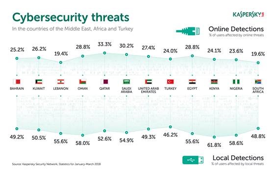 During the event, statistics from the Kaspersky Security Network for the first quarter of 2018 were revealed and showed an overall increase in local threats infections (malware spread in local networks, by USBs, CDs, DVDs) with Kenya taking the first place with 61.8% of its users infected, followed by 58.6% in Nigeria, 50.8% in Oman, and 55.6% in both Egypt and Lebanon. Turkey reported the lowest number of local threat infections with 46.2%.